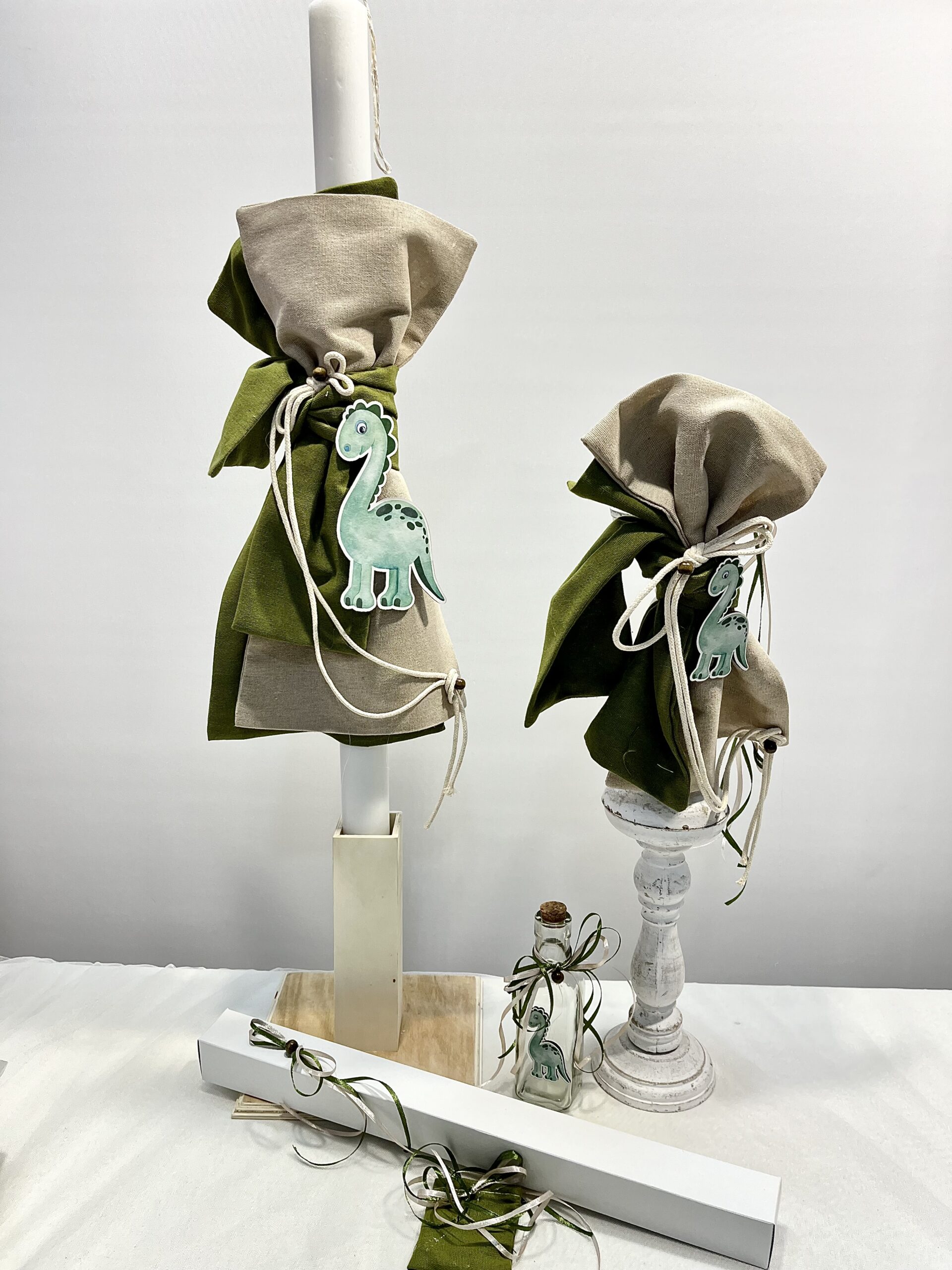 Χειροποίητο σετ λαμπάδας για αγόρι με θέμα δεινοσαυράκι. Το σετ περιλαμβάνει τη λαμπάδα, το μπρανς και το λαδοσέτ.