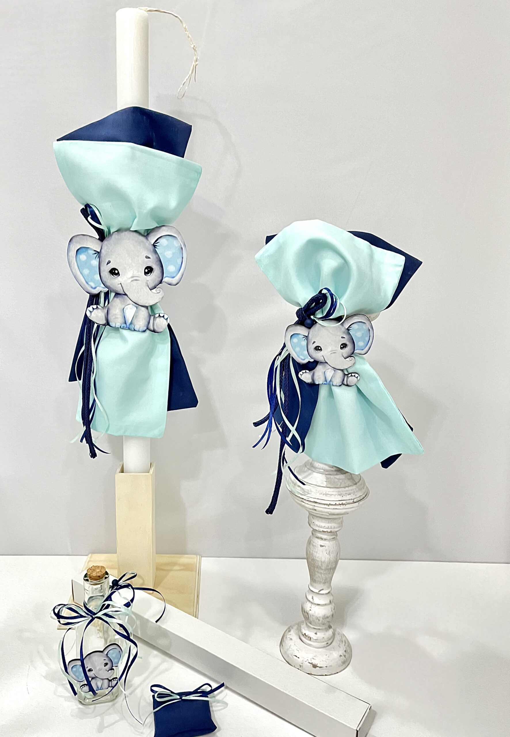 Χειροποίητη λαμπάδα και μπρανς για αγόρι, με θέμα ελεφαντάκι. Με μπλε και βεραμάν πανί και κορδέλα.