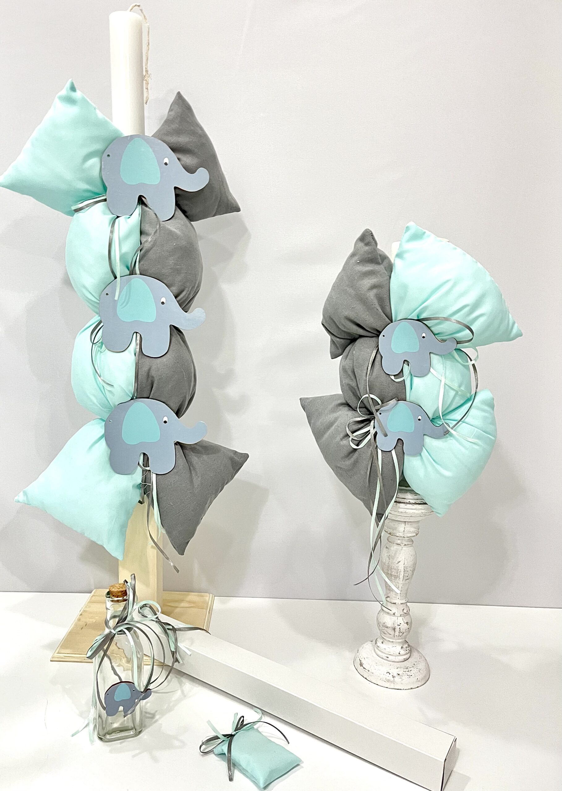 Χειροποίητο σετ λαμπάδας για αγόρι με θέμα ελεφαντάκια. Το σετ περιλαμβάνει τη λαμπάδα, το μπρανς και το λαδοσέτ.