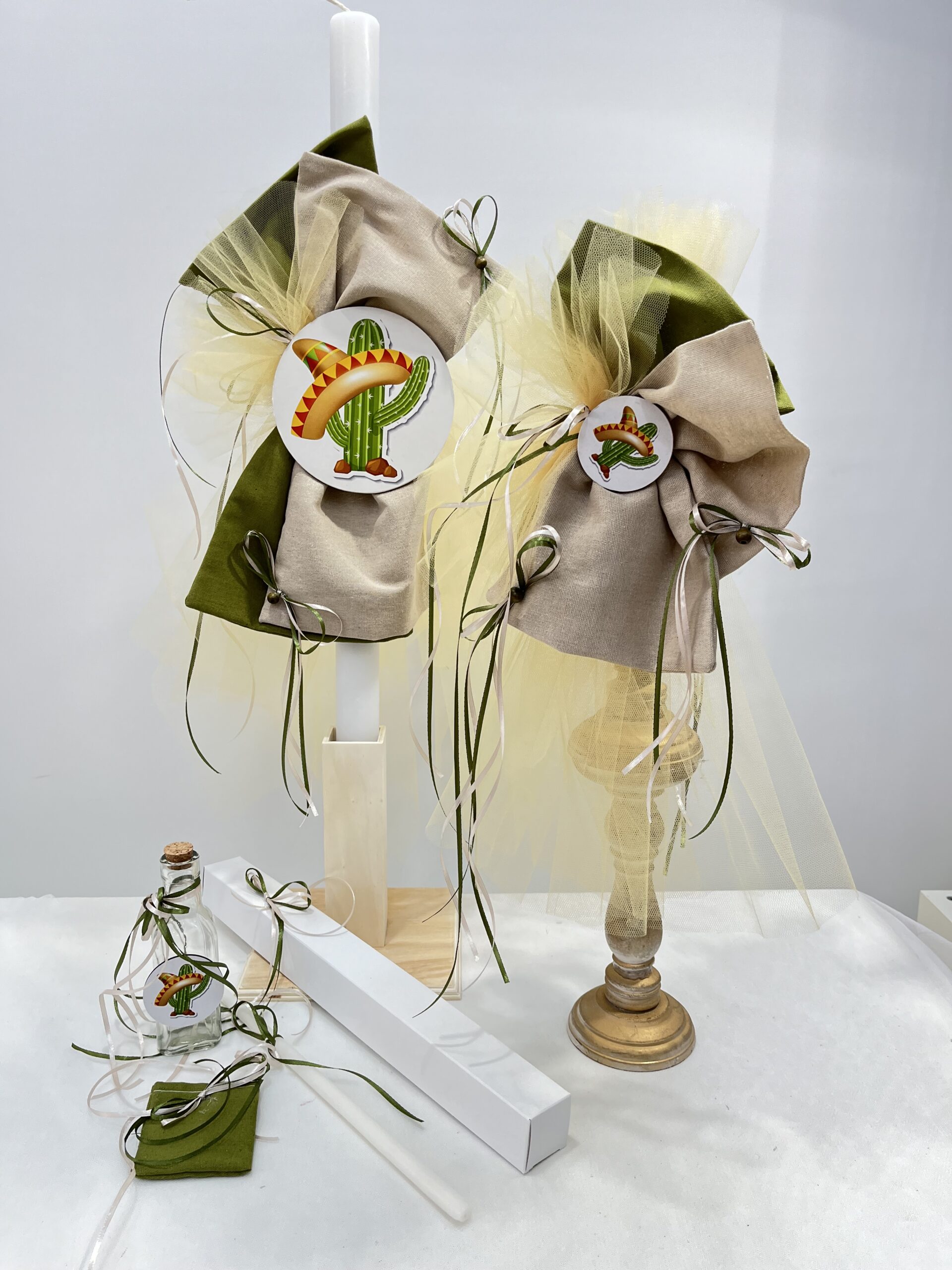 Χειροποίητο σετ λαμπάδας για αγόρι με θέμα Κάκτος. Το σετ περιλαμβάνει τη λαμπάδα, το μπρανς και το λαδοσέτ.