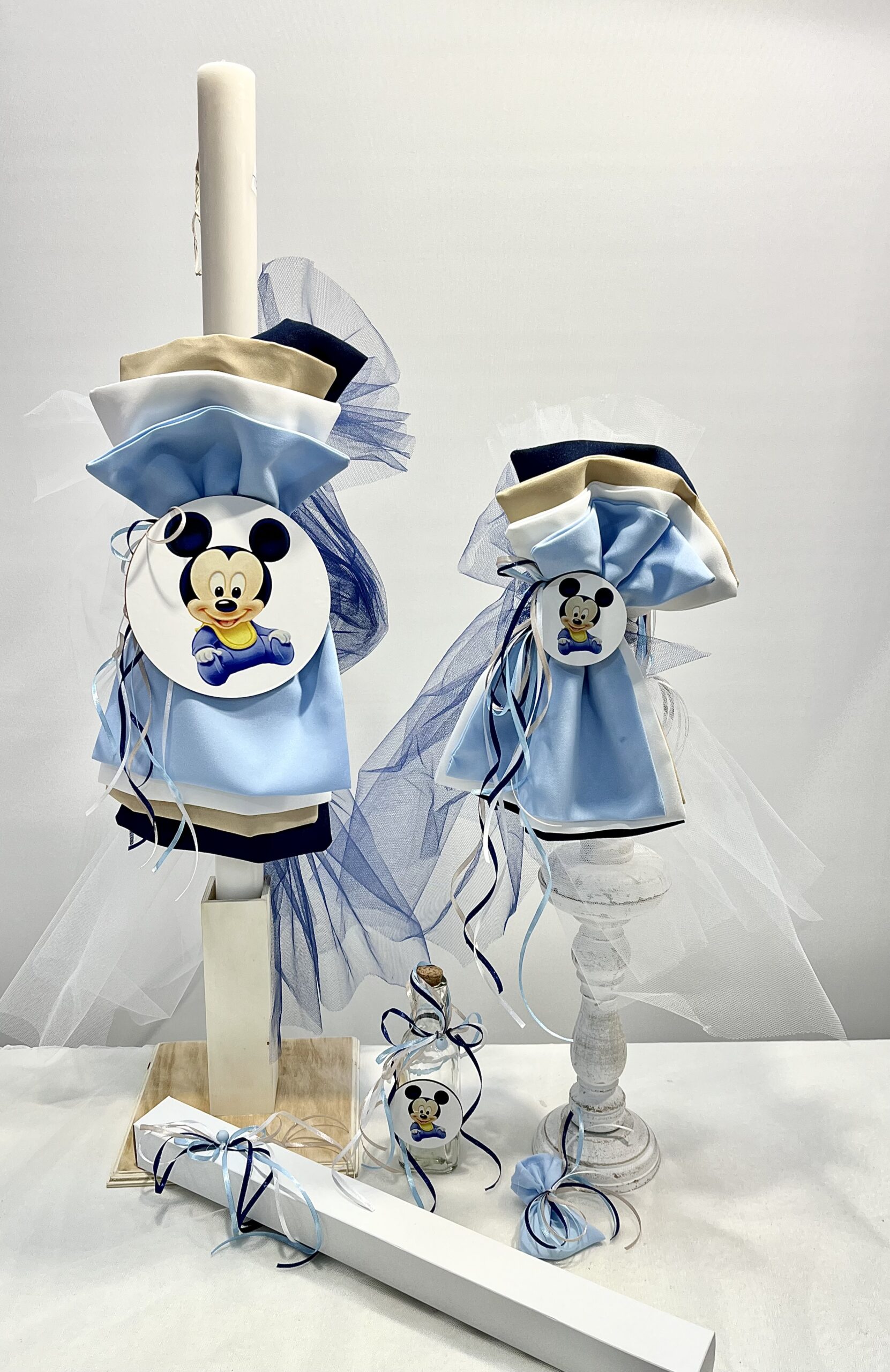 Χειροποίητο σετ λαμπάδας για αγόρι με θέμα Μίκυ Μάους. Το σετ περιλαμβάνει τη λαμπάδα, το μπρανς και το λαδοσέτ.