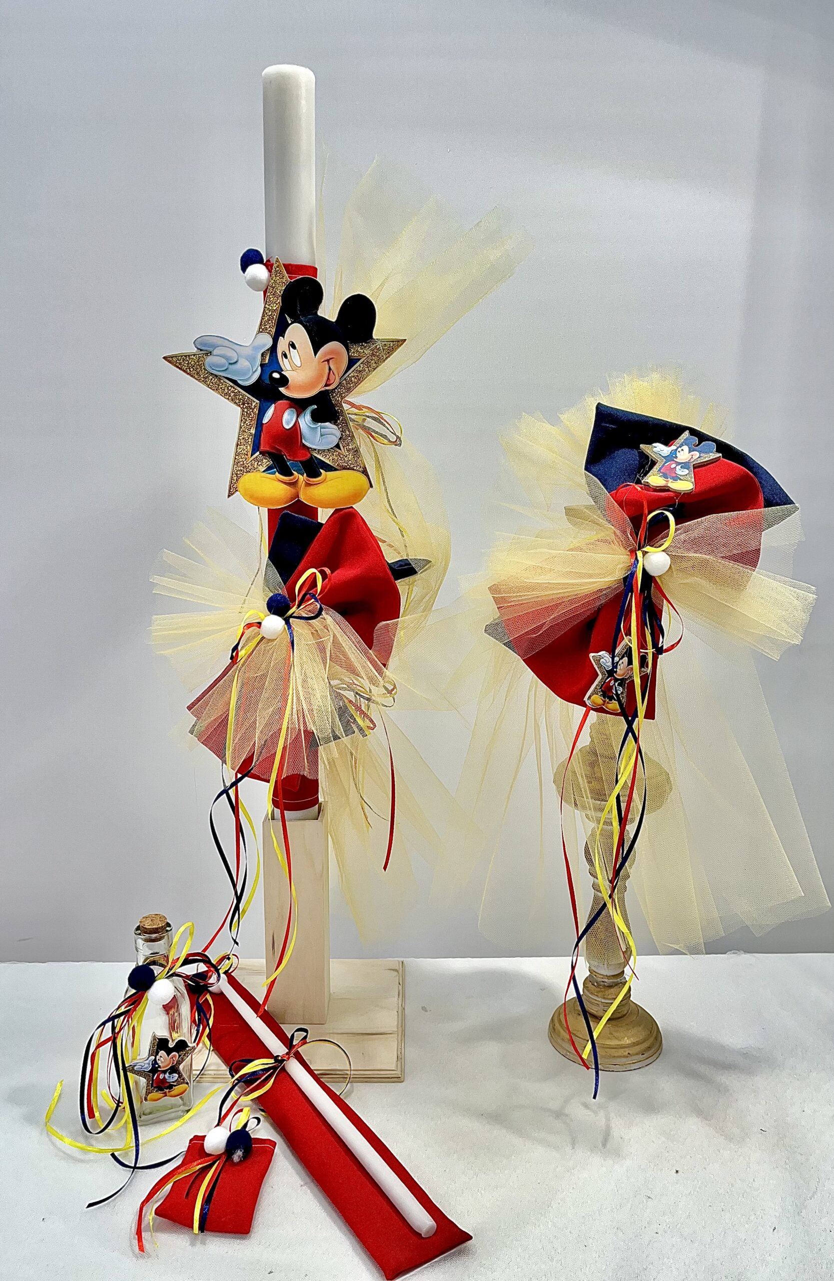 Χειροποίητη λαμπάδα και μπρανς για αγόρι, με θέμα Μίκυ Μάους. Με κόκκινο πανί, κίτρινο τούλι και πον πον.