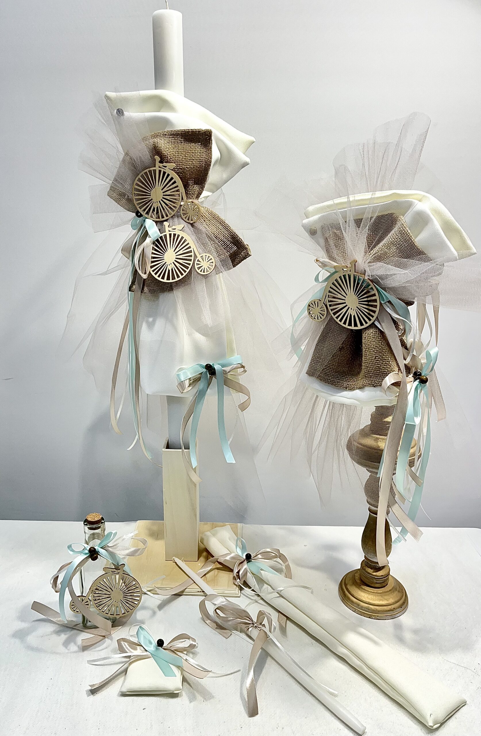 Χειροποίητο σετ λαμπάδας για αγόρι, με θέμα ποδήλατο. Το σετ περιλαμβάνει τη λαμπάδα, το μπρανς και το λαδοσέτ.