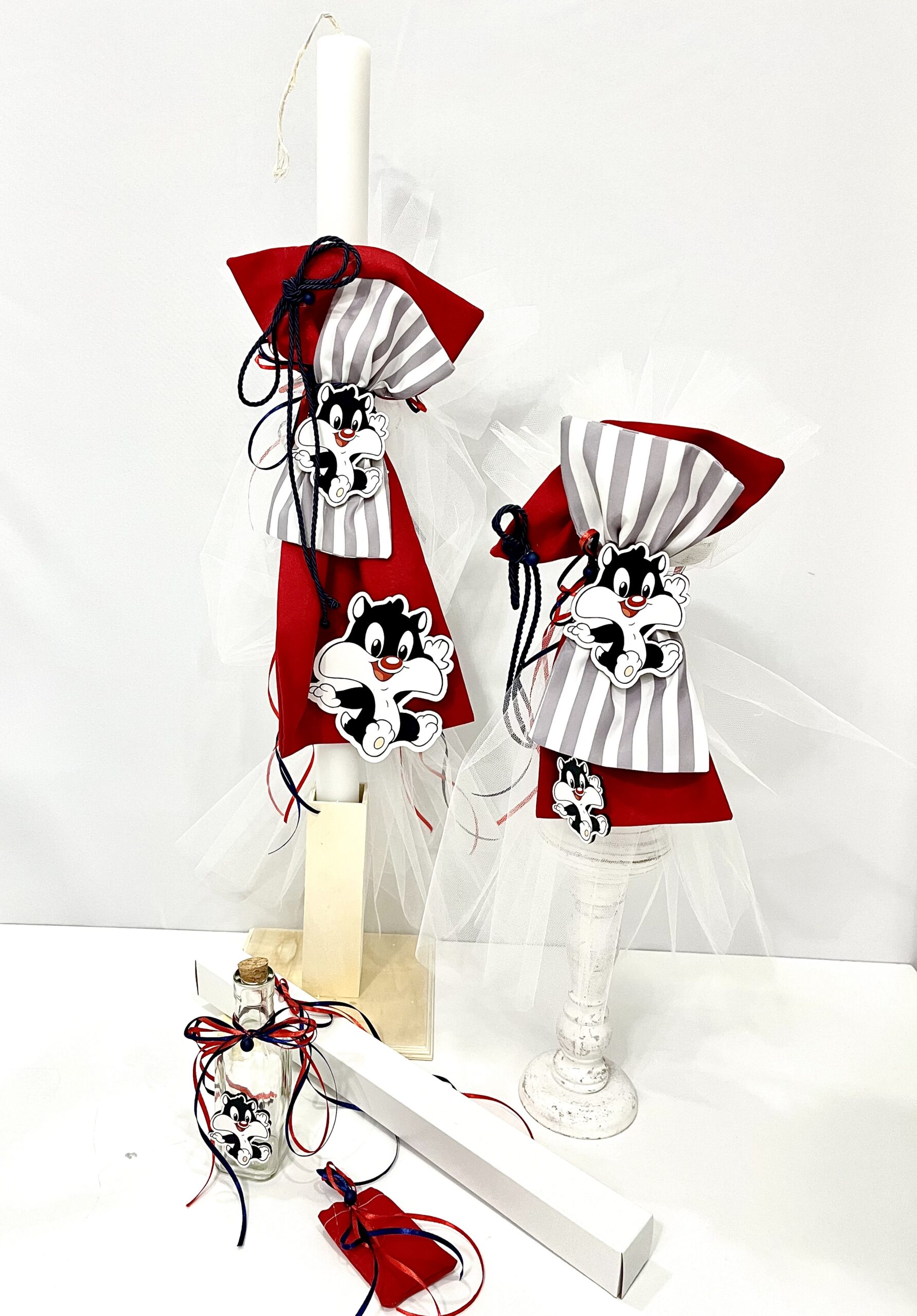 Χειροποίητο σετ λαμπάδας για αγόρι με θέμα Σιλβέστερ. Το σετ περιλαμβάνει τη λαμπάδα, το μπρανς και το λαδοσέτ.