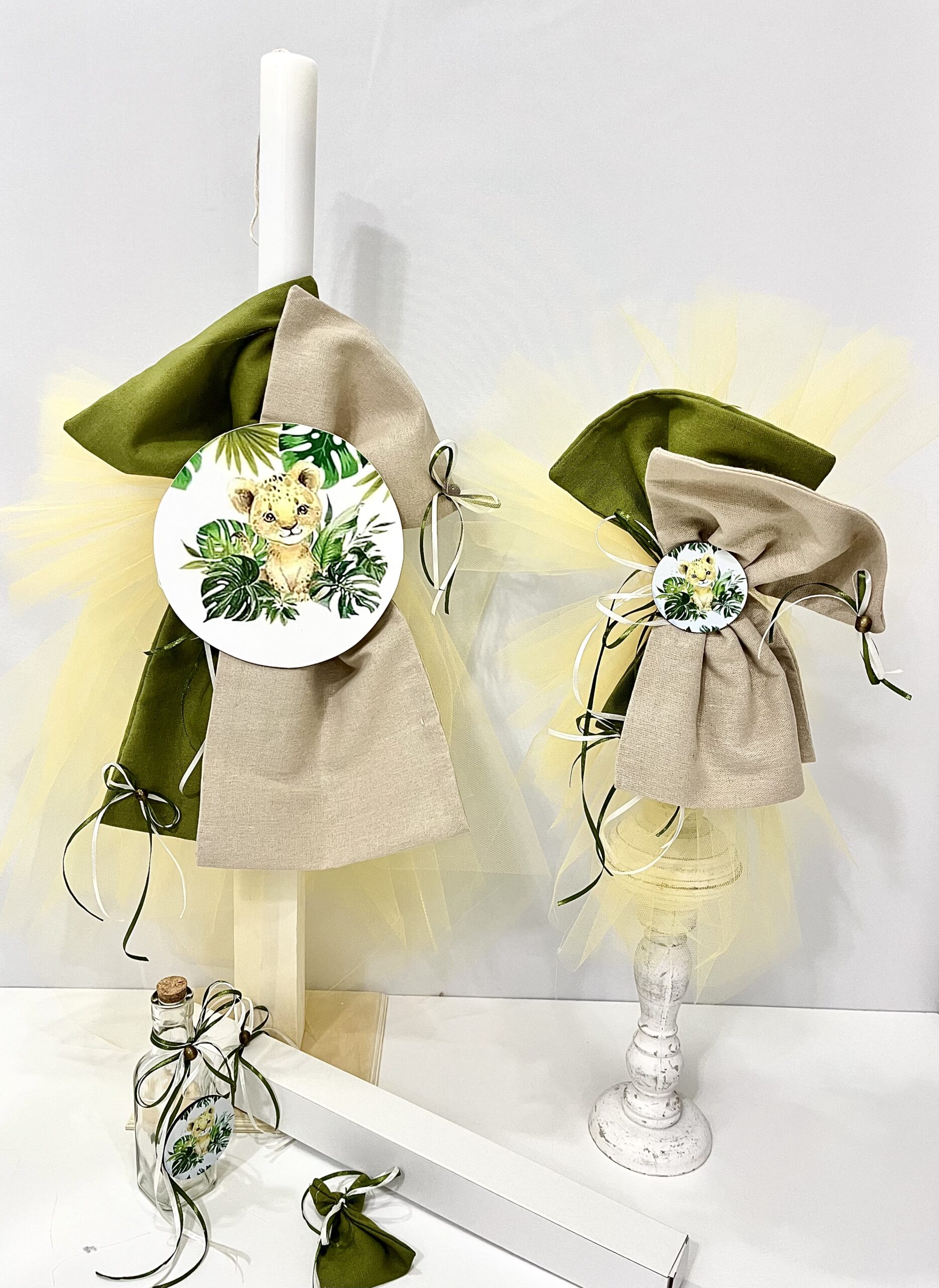 Χειροποίητο σετ λαμπάδας για αγόρι με θέμα Σίμπα. Το σετ περιλαμβάνει τη λαμπάδα, το μπρανς και το λαδοσέτ.