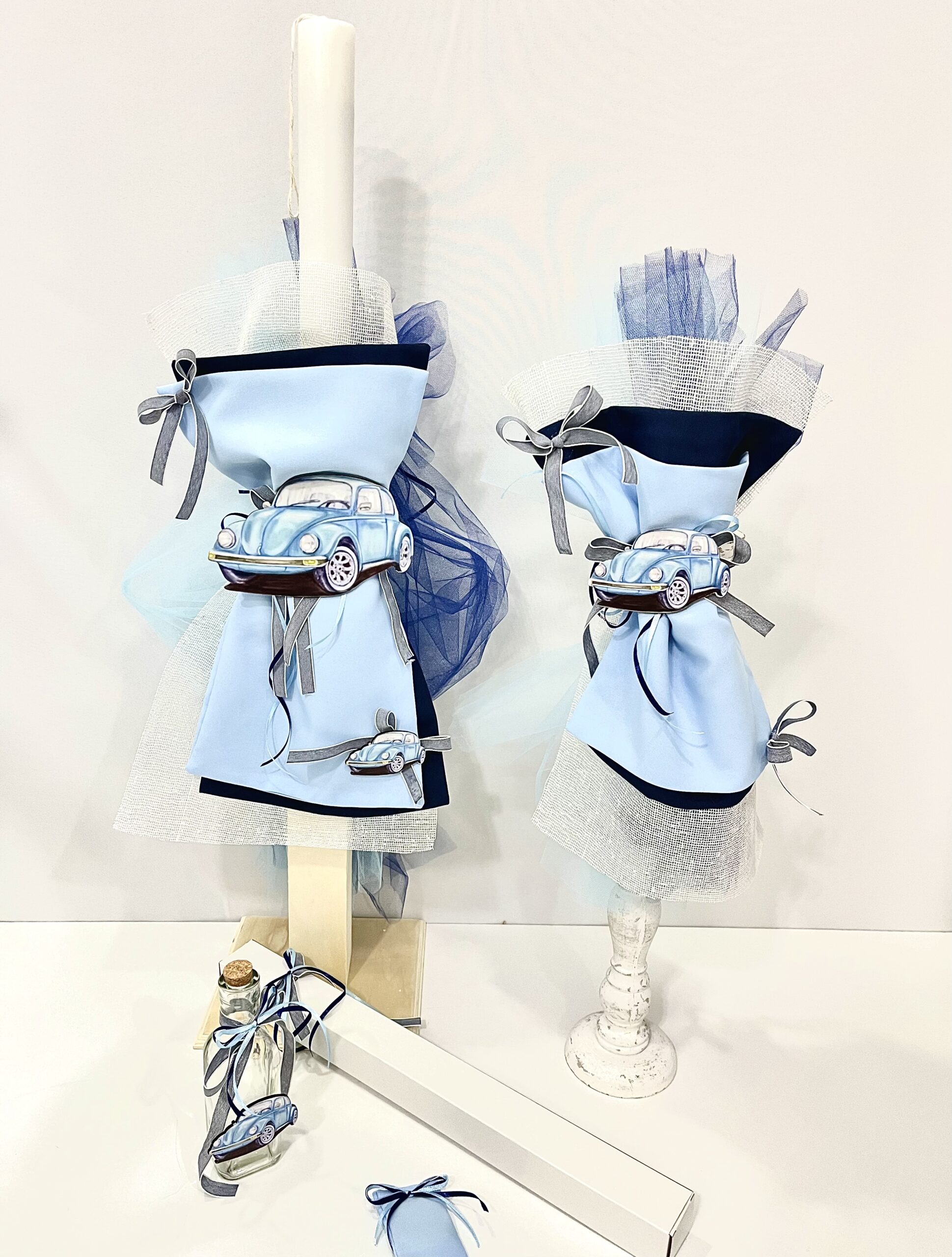 Χειροποίητο σετ λαμπάδας για αγόρι με θέμα vintage αυτοκίνητο. Το σετ περιλαμβάνει τη λαμπάδα, το μπρανς και το λαδοσέτ.
