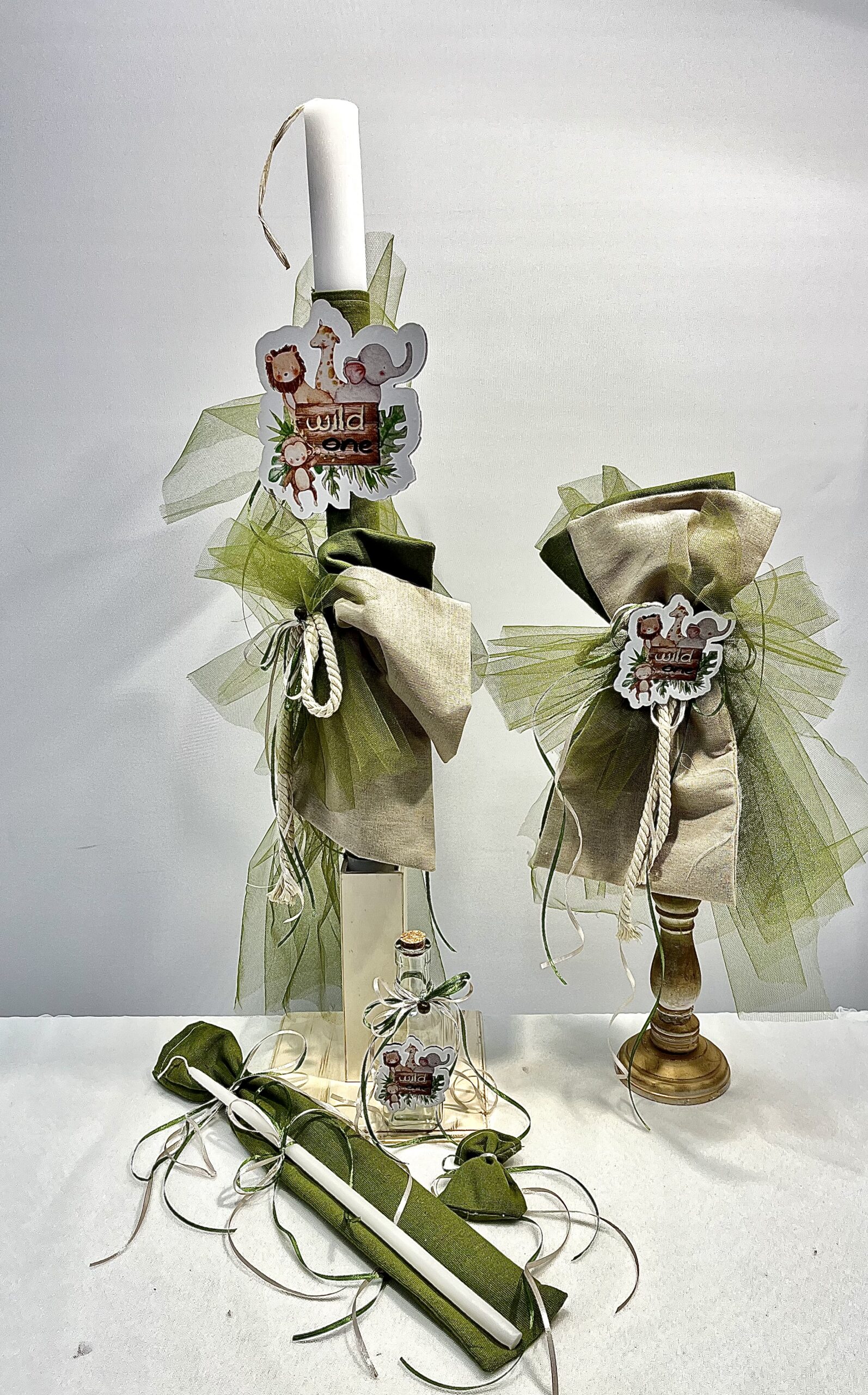 Χειροποίητο πακέτο βάπτισης για αγόρι με θέμα ζωάκια του δάσους. Το πακέτο περιλαμβάνει το τζιπ, τη λαμπάδα, τα λαδόπανα, το λαδοσέτ και 50 μαρτυρικά.