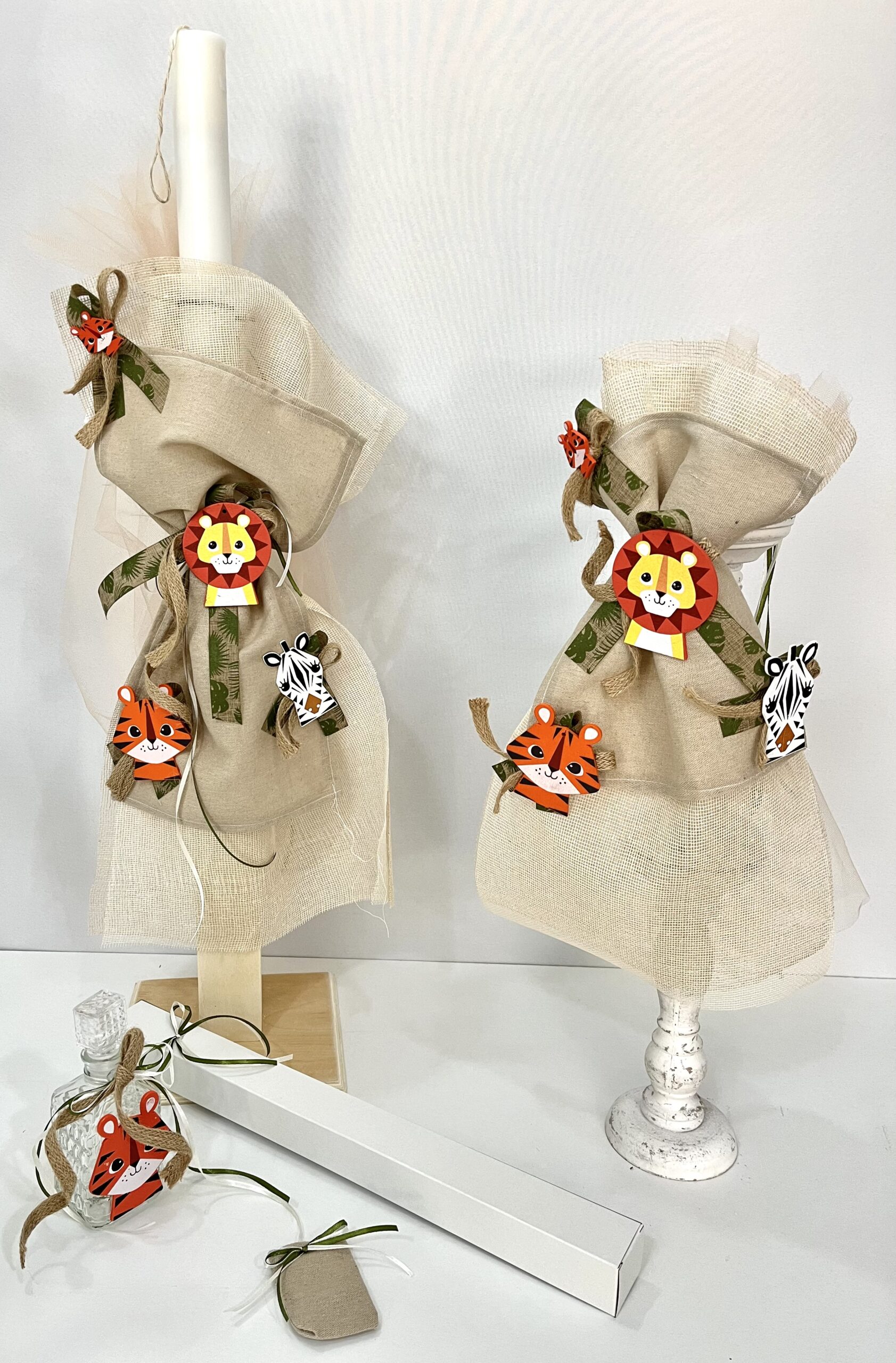 Χειροποίητο σετ λαμπάδας για αγόρι με θέμα ζωάκια του δάσους . Το σετ περιλαμβάνει τη λαμπάδα, το μπρανς και το λαδοσέτ