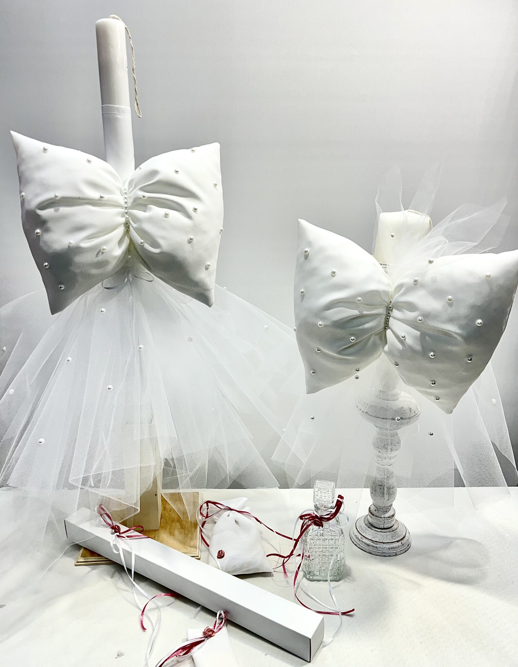 Χειροποίητο σετ λαμπάδας για κορίτσι με θέμα φιόγκος. Το σετ περιλαμβάνει τη λαμπάδα, το μπρανς και το λαδοσέτ.