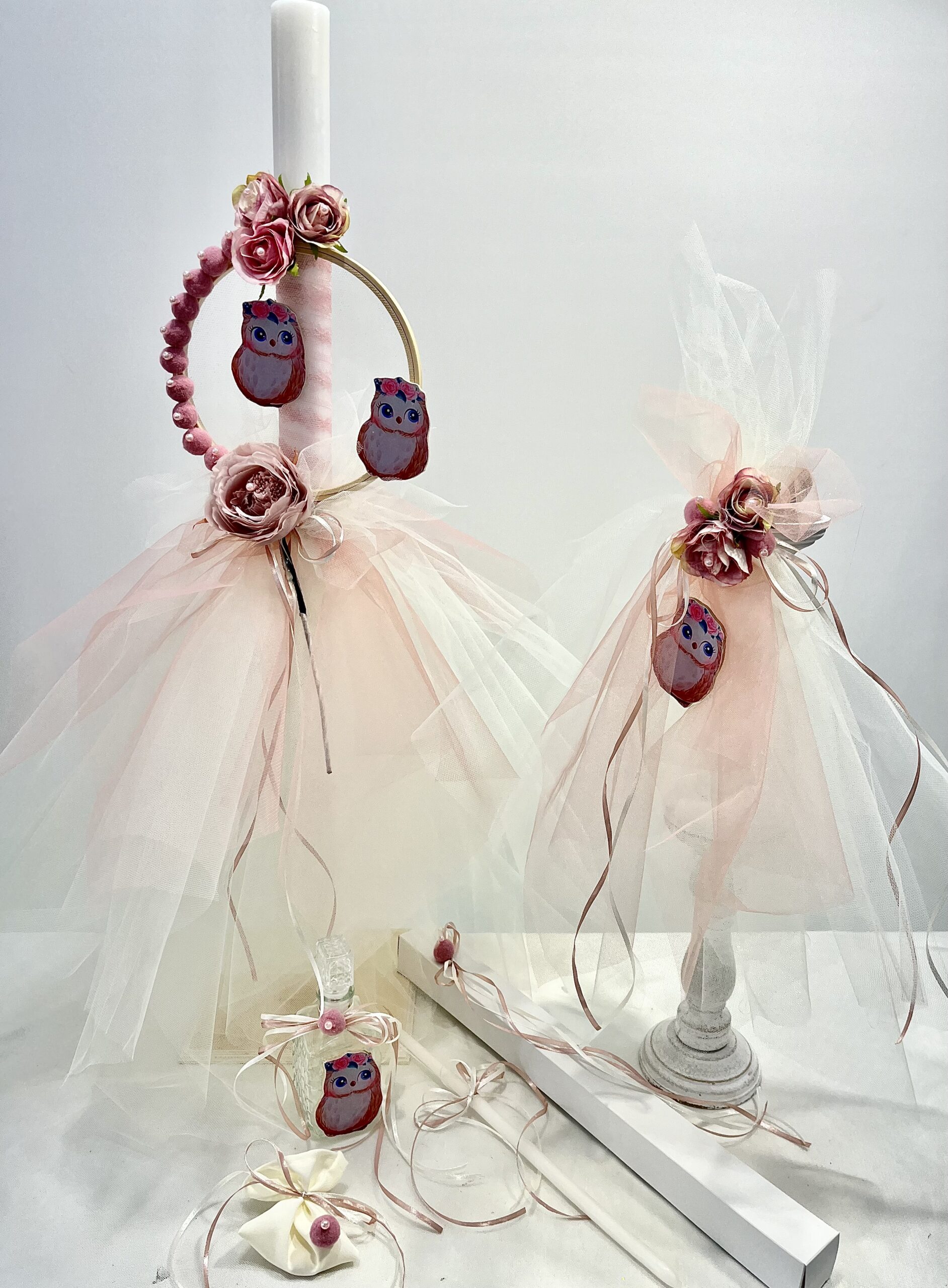 Χειροποίητο σετ λαμπάδας για κορίτσι με θέμα κουκουβάγια. Το σετ περιλαμβάνει τη λαμπάδα, το μπρανς και το λαδοσέτ.