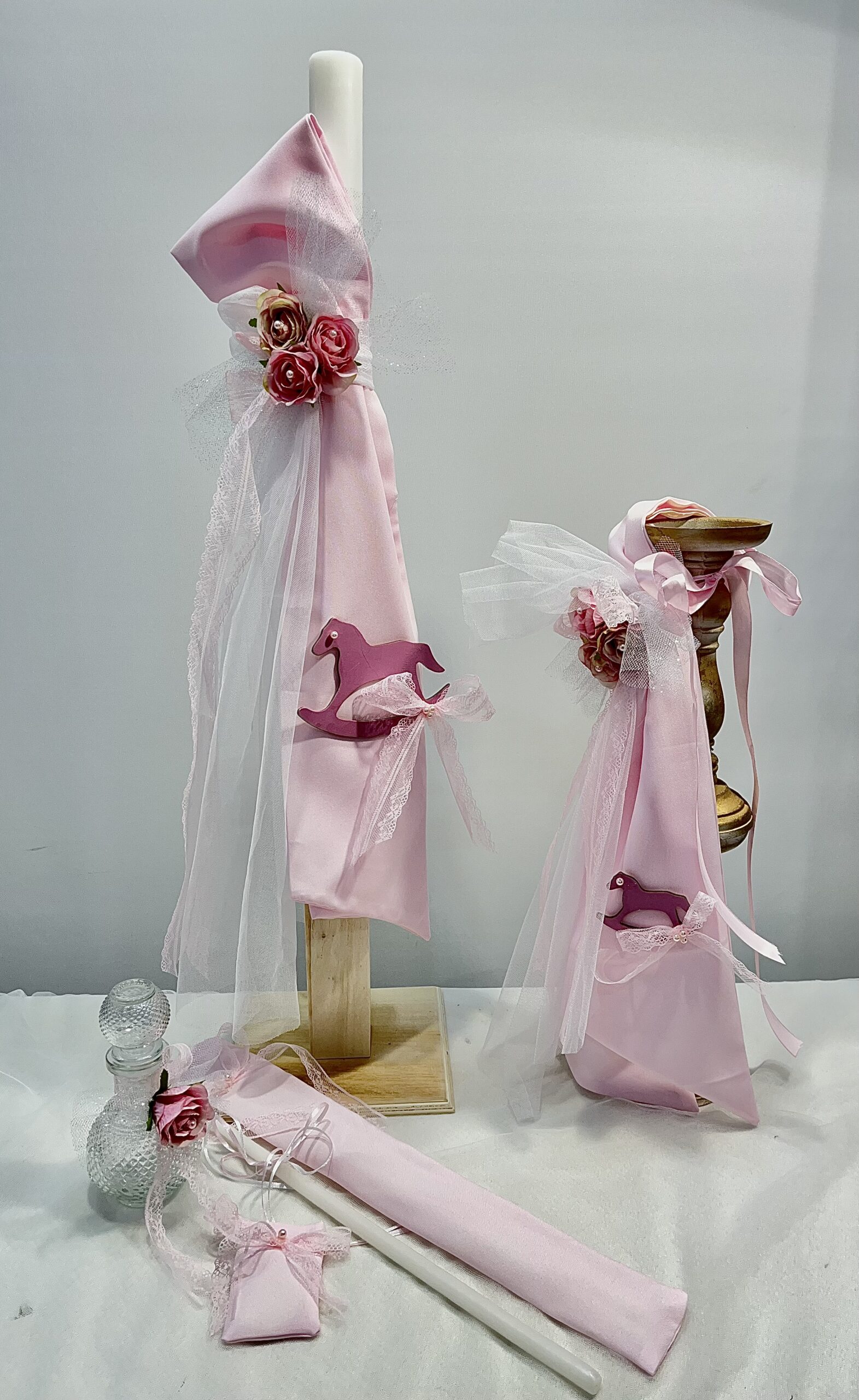 Χειροποίητη λαμπάδα και μπρανς για κορίτσι, με θέμα κουνιστό αλογάκι. Με ροζ και λευκό πανί και διακοσμητικά λουλούδια.