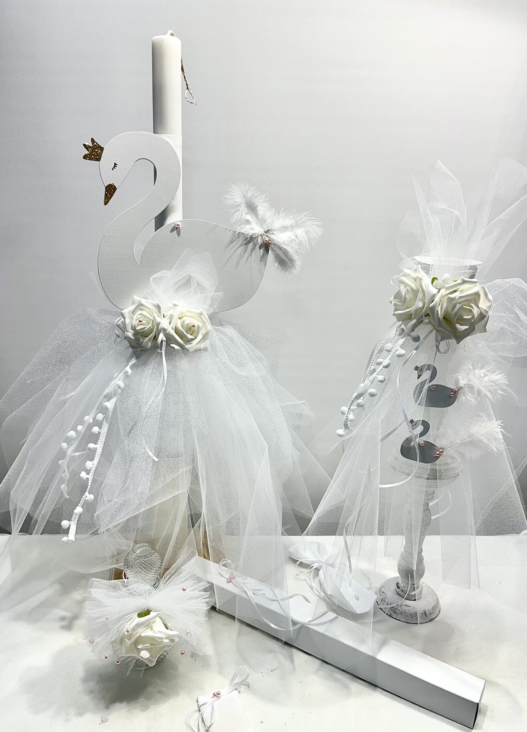 Χειροποίητο σετ λαμπάδας για κορίτσι με θέμα κύκνο. Το σετ περιλαμβάνει τη λαμπάδα, το μπρανς και το λαδοσέτ.