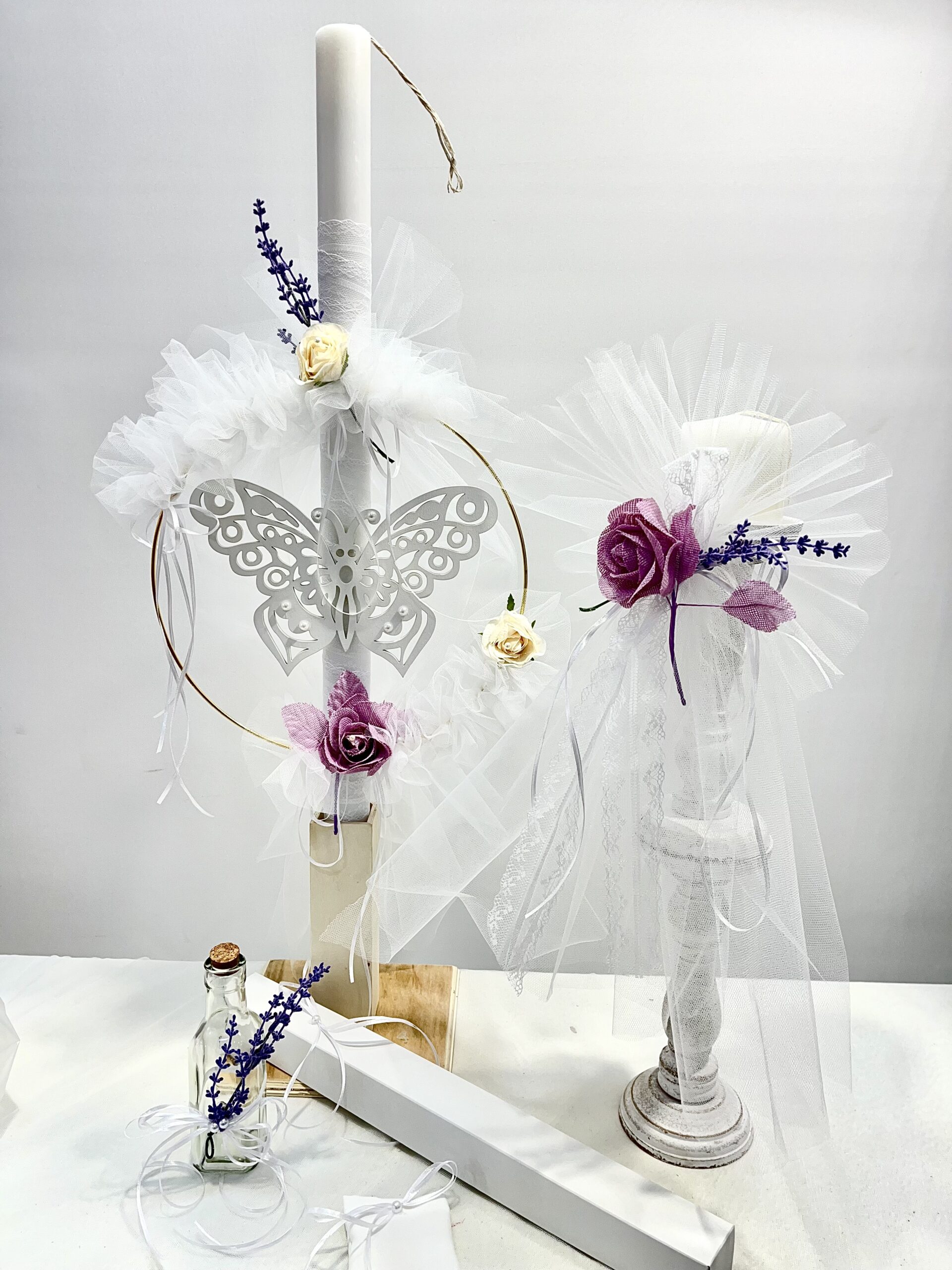 Χειροποίητη λαμπάδα και μπρανς για κορίτσι, με θέμα πεταλούδα. Με λευκό τούλι, διακοσμητικό κλωνάρι λεβάντας και λουλούδια και διακοσμητικές πέρλες.