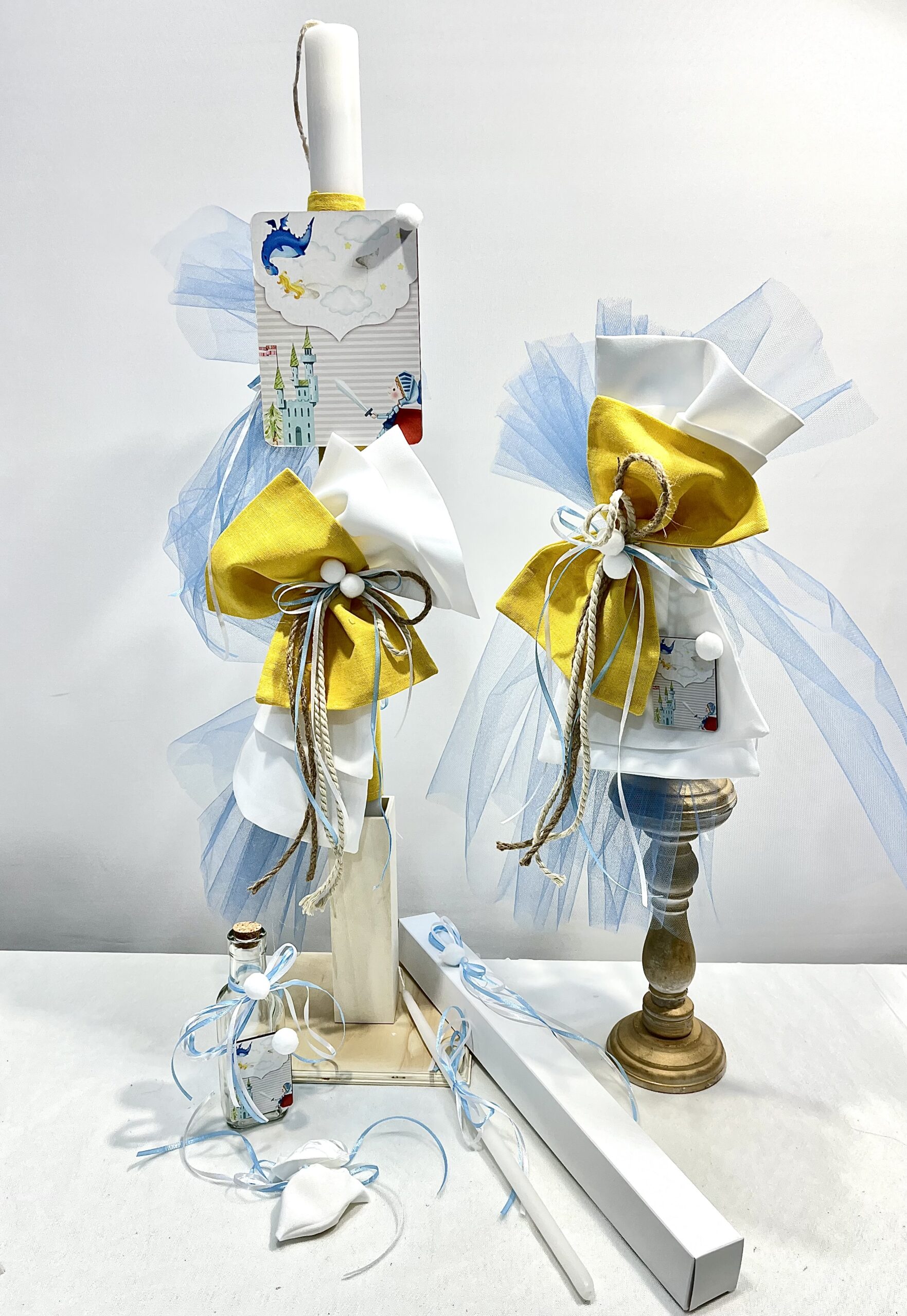 Χειροποίητη λαμπάδα και μπρανς για αγόρι, με θέμα ιππότης. Με κίτρινο και ασπρο πανί, καραβοσχοινο και λευκά πον πον.