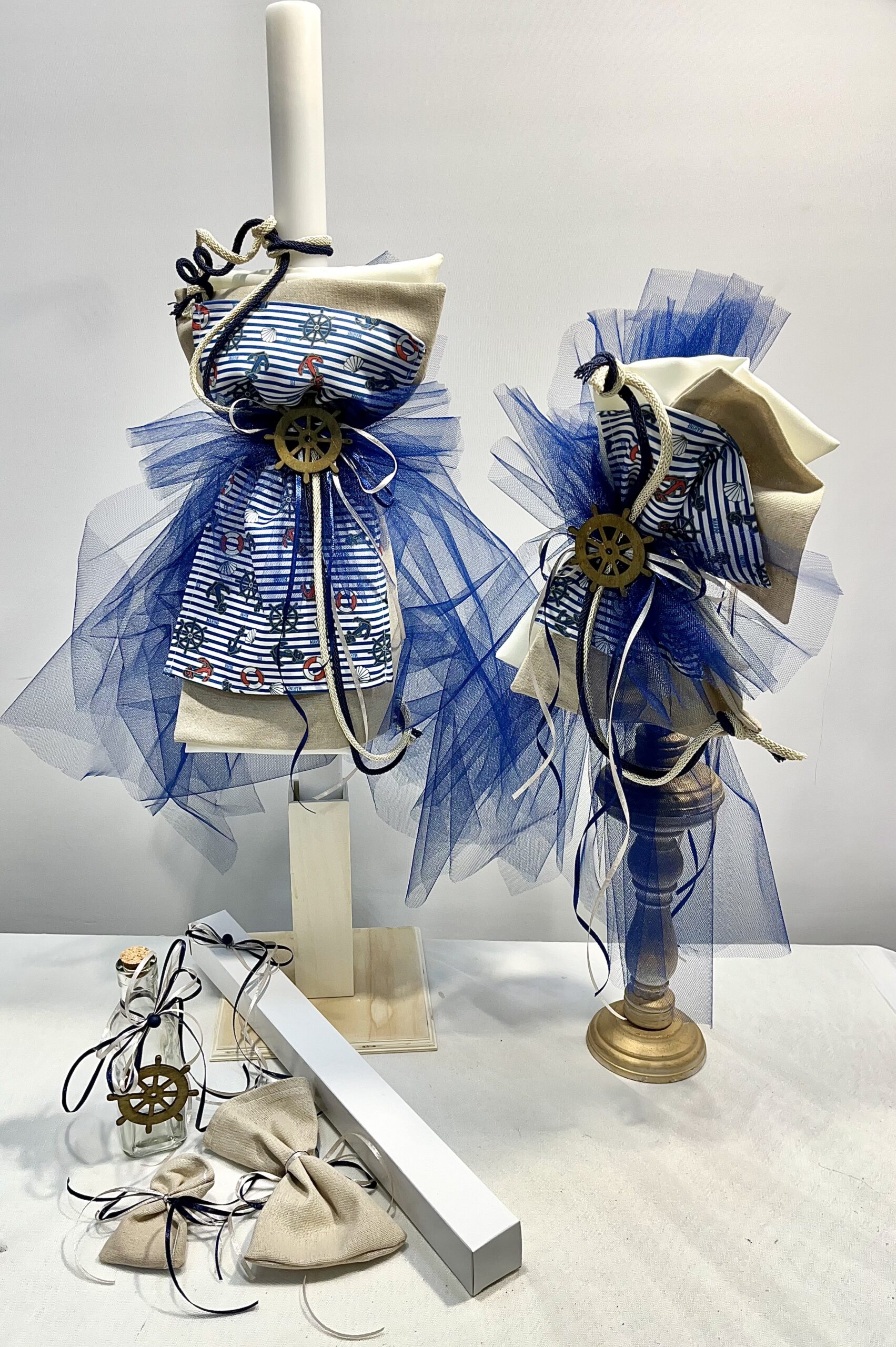 Χειροποίητο σετ λαμπάδας για αγόρι με θέμα ναυτικό τιμόνι. Το σετ περιλαμβάνει τη λαμπάδα, το μπρανς και το λαδοσέτ.