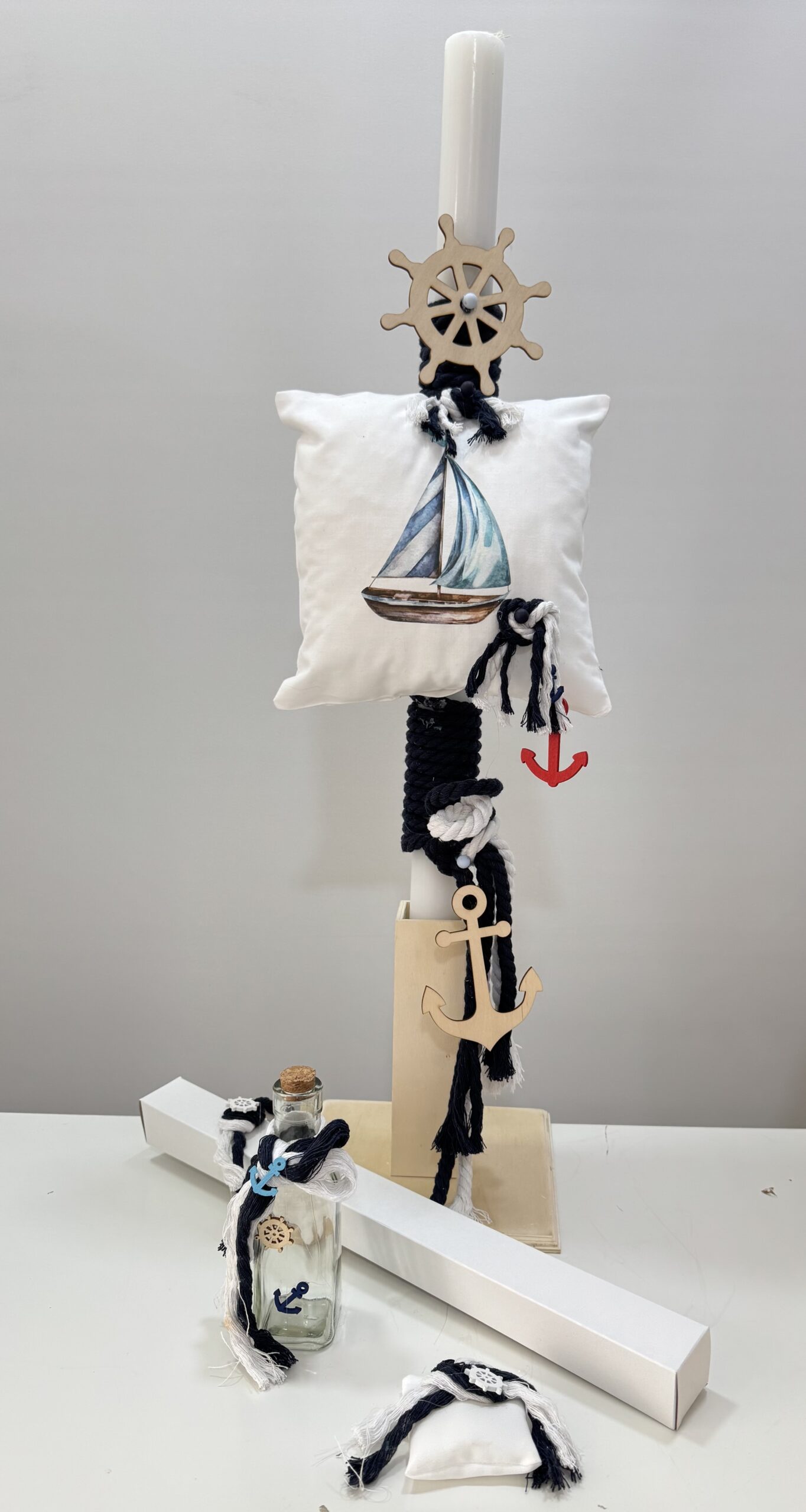 Χειροποίητο σετ λαμπάδας για αγόρι με θέμα Ιστιοπλοϊκό. Το σετ περιλαμβάνει τη λαμπάδα, το μπρανς και το λαδοσέτ.