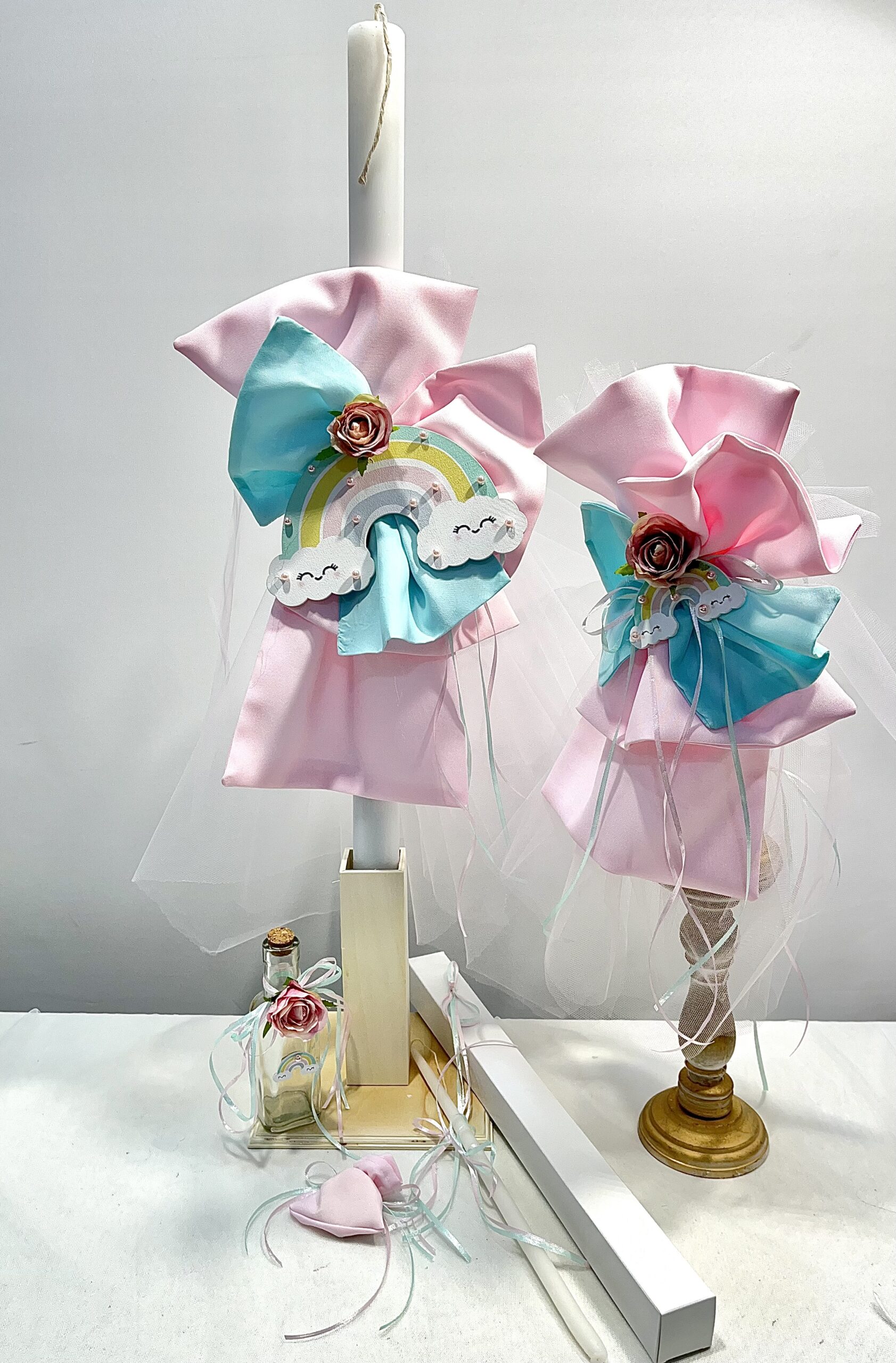 Χειροποίητο σετ λαμπάδας για κορίτσι με θέμα ουράνιο τόξο. Το σετ περιλαμβάνει τη λαμπάδα, το μπρανς και το λαδοσέτ.