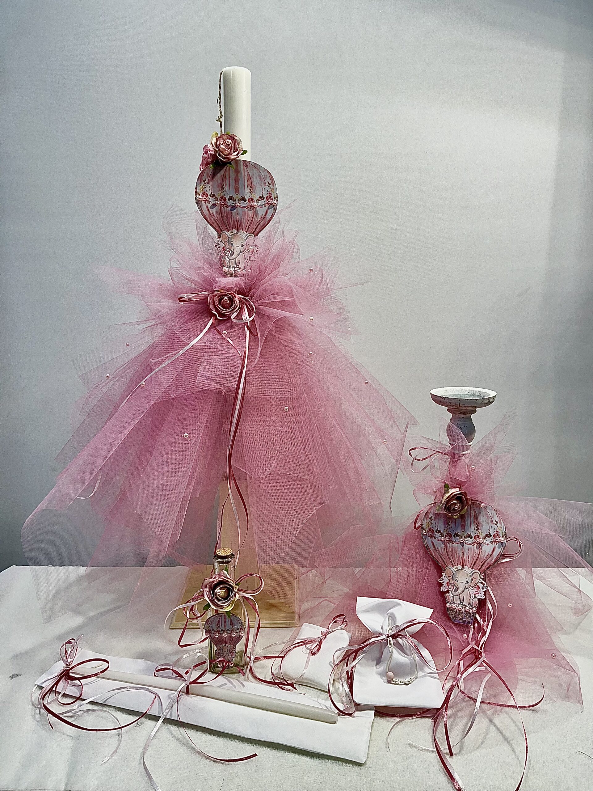Χειροποίητο σετ λαμπάδας για κορίτσι με θέμα αερόστατο. Το σετ περιλαμβάνει τη λαμπάδα, το μπρανς και το λαδοσέτ.