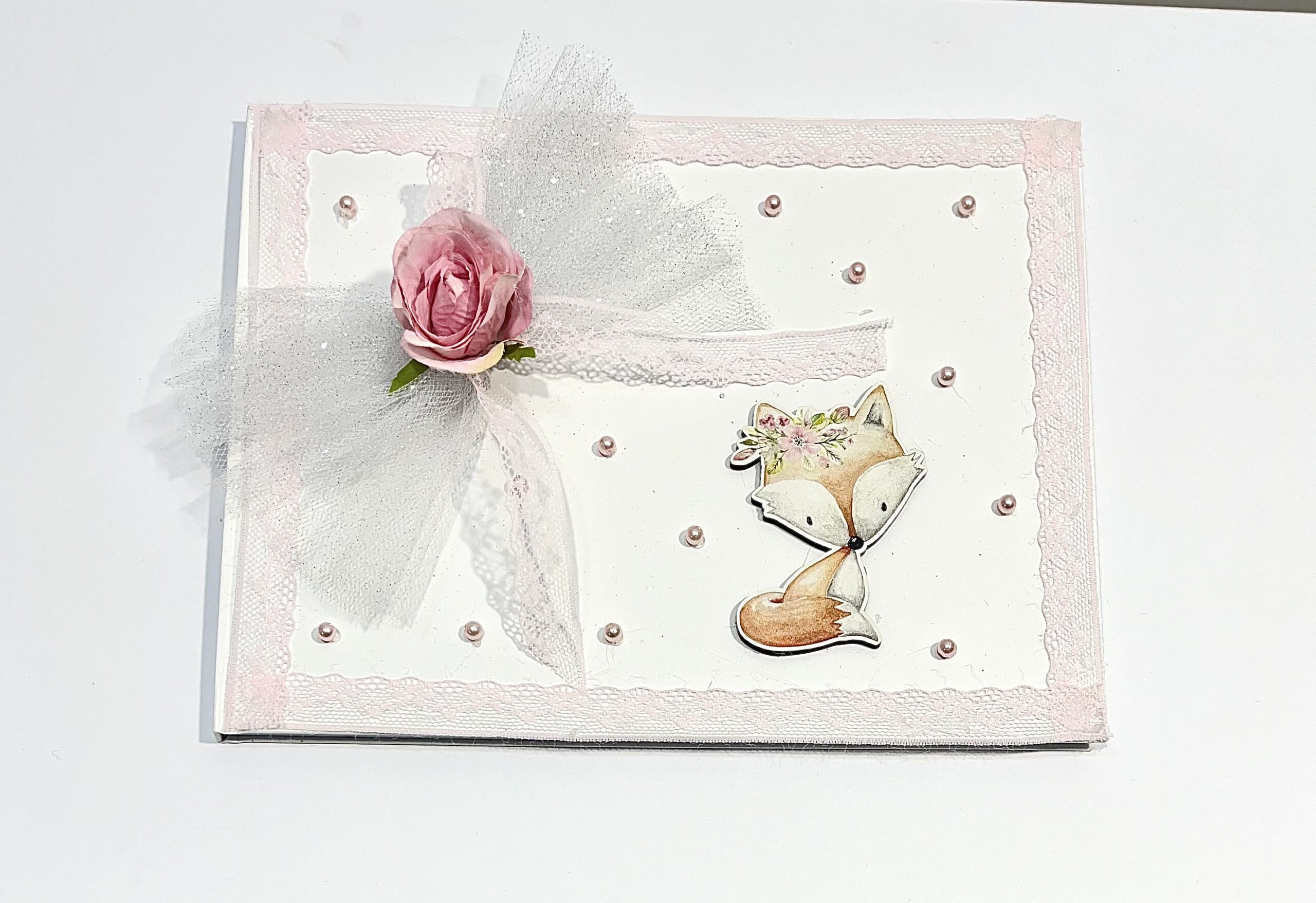 Χειροποίητο βιβλίο ευχών για κορίτσι με θέμα αλεπού, γυαλιστερό τούλι, ροζ δαντέλα, λουλούδι και διακοσμητικές πέρλες.
