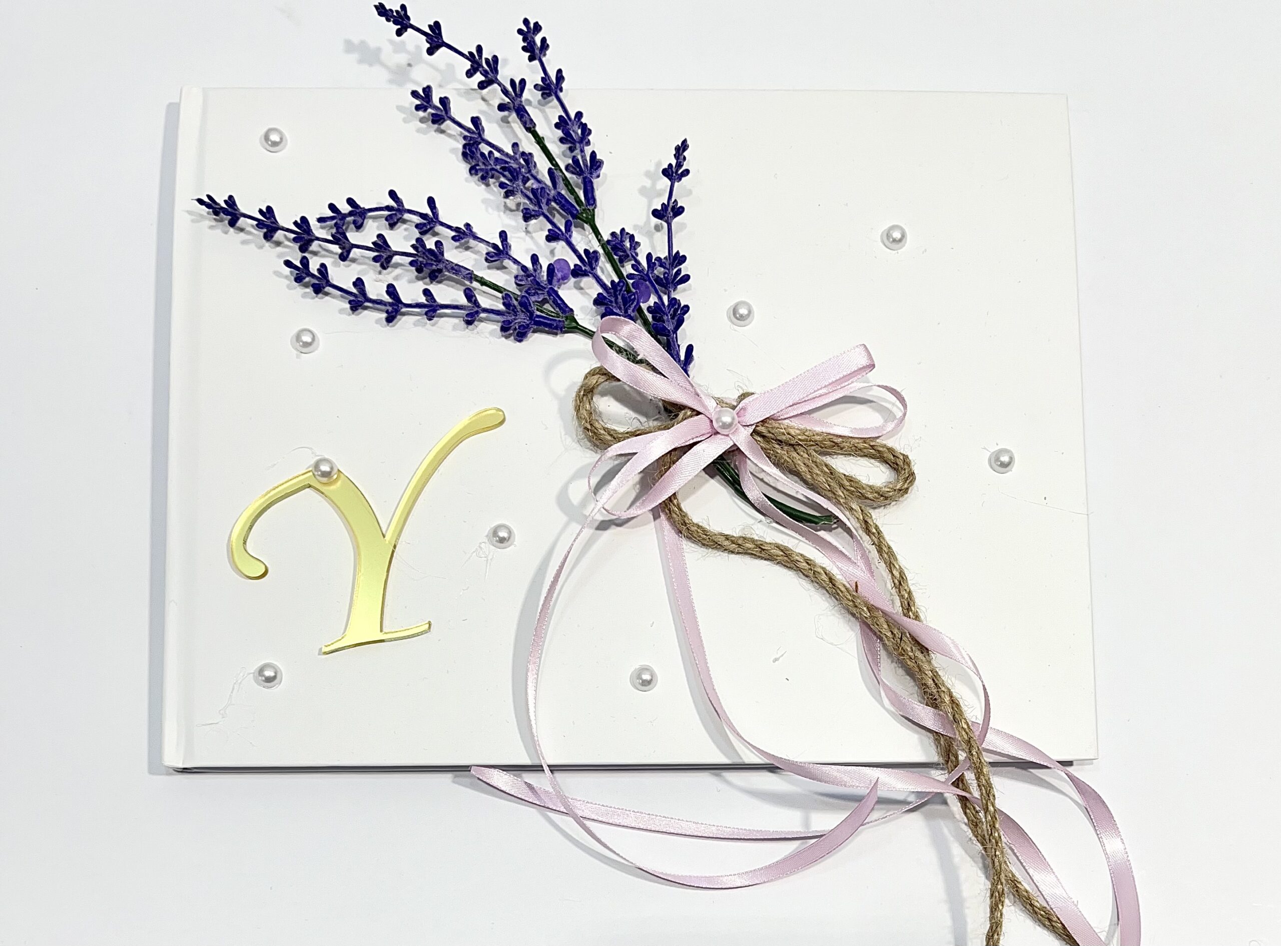 Χειροποίητο βιβλίο ευχών για κορίτσι με θέμα λεβάντα και μονόγραμμα της επιλογής σας. Σχοινί σε φυσικό χρώμα, λιλά κορδέλα, πέρλες και διακοσμητικά κλωνάρια λεβάντας.
