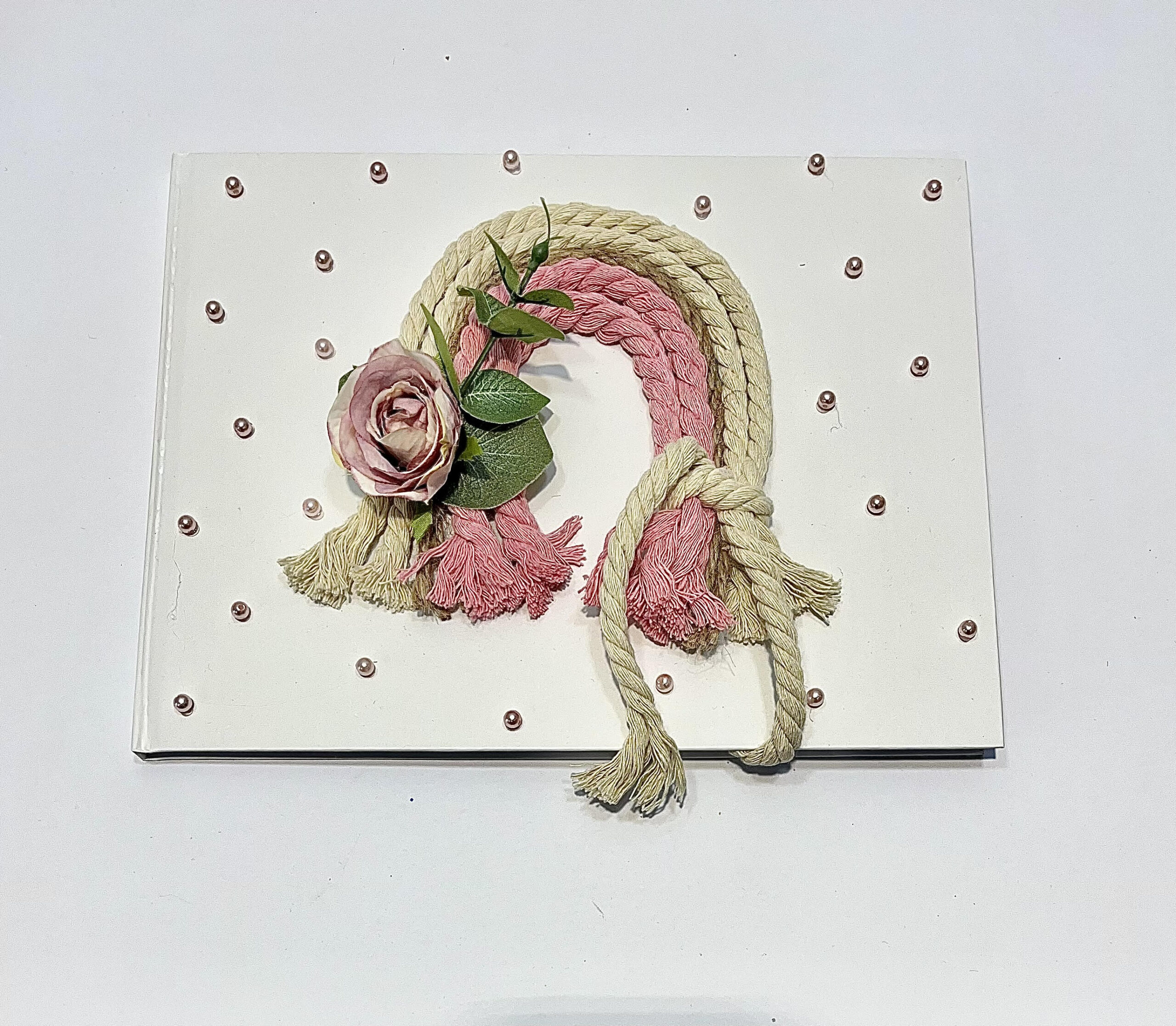 Χειροποίητο βιβλίο ευχών για κορίτσι με θέμα ουράνιο τόξο, καραβόσχοινο, πέρλες και διακοσμητικό τριαντάφυλλο.